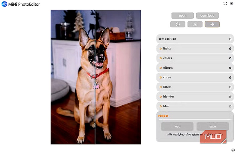 Luôn tiện đây, có một nút chuyển đổi chế độ xem chia đôi nhỏ nằm ở góc trên bên phải của trang. Bật nó lên và bạn có thể so sánh ảnh trước và sau khi chỉnh sửa theo thời gian thực. Cuối cùng, nếu bạn chọn được bộ điều chỉnh hoàn hảo, tính năng Recipes sẽ cho phép bạn lưu các điều chỉnh thành cài đặt sẵn. Bằng cách này, bạn có thể áp dụng cùng một kiểu cho toàn bộ ảnh mà không cần lặp lại từng bước.