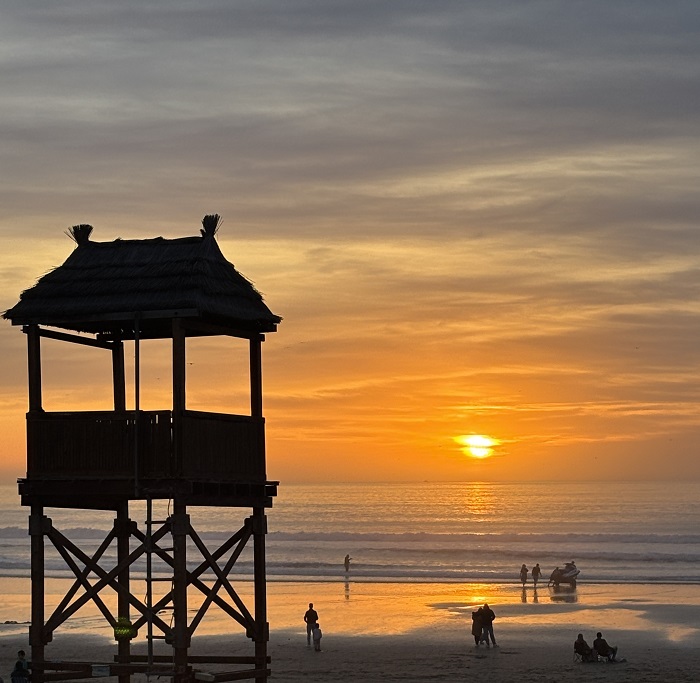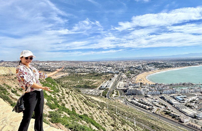 Rời Essaouira, chúng tôi đón xe buýt đến Agadir, một thành phố nằm ở miền Nam Ma Rốc, nổi bật với những bãi cát dài mịn và ánh nắng chan hòa quanh năm. Khác với vẻ cổ kính của Essaouira hay nhộn nhịp của Marrakech, Agadir mang đến cảm giác hiện đại, thư giãn và phóng khoáng, với bãi biển dài là làn nước xanh biếc, những chiếc ghế tắm nắng san sát và sóng biển nhè nhẹ vỗ vào bờ, khiến bất kỳ ai đặt chân tới cũng muốn dừng lại lâu hơn.