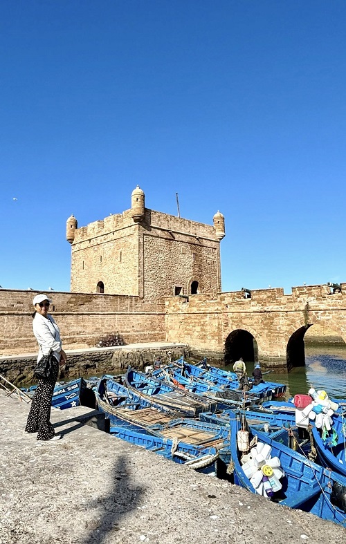 Từ Marrakech, chúng tôi đón xe đến Essaouira, một thành phố biển nằm bên bờ Đại Tây Dương, mang trong mình một vẻ đẹp bình yên hiếm có giữa Ma Rốc. Những bức tường được kết hợp bằng 2 màu trắng và xanh, những con hẻm nhỏ uốn lượn quanh các riad cổ kính, khiến người lữ khách cứ ngỡ như đang bước vào một bức tranh sống động. Không ồn ào, náo nhiệt như Marrakech, Essaouira chào đón người qua kẻ lại bằng không khí thư thả, tiếng sóng rì rào và gió biển mênh mang.