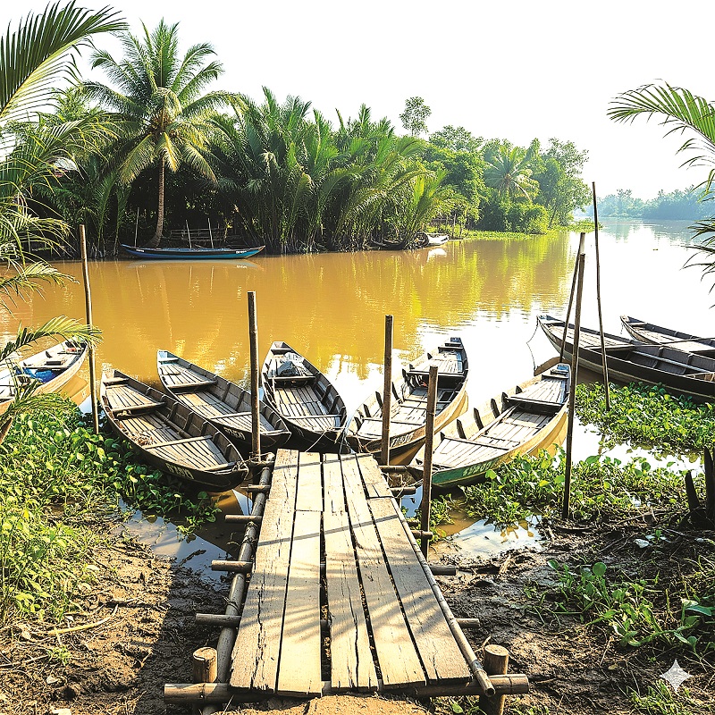 Sàn nước, thuyền tam bản và dừa nước (Do AI của Google vẽ)