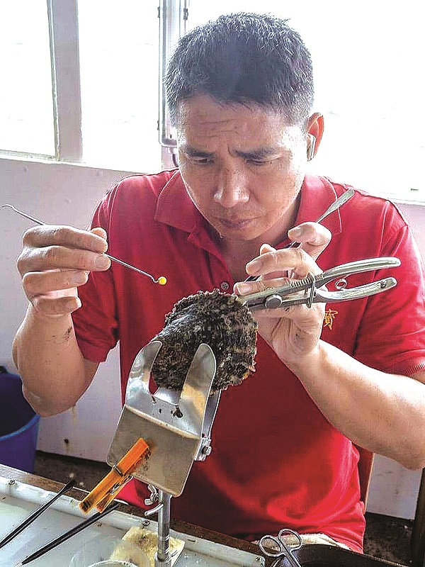 Công việc hàng ngày tại trang trại nuôi trai theo trình tự. Một nữ nhân viên ghép một cái nêm vào van của những con ‘hàu nhận con’ để giữ miệng chúng luôn há mở. “Những con hàu mẹ này được chọn lọc trong số những con có màu sắc đẹp nhất. Từ những con hàu chọn lọc này, Xiaoqin, nhân viên ghép hàu người Hoa, lấy ra các mô sống nhỏ bé tí”, Vaimiti cho biết.