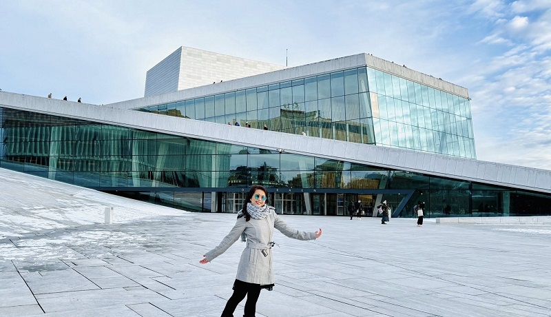 Đi hết con đường Karl Johan, rẽ qua bên phải một chút là Nhà hát Opera, kiêu hãnh mọc lên bên bờ biển, như một tảng băng lớn đang trôi dạt. Không rực rỡ, không ồn ào, chỉ trắng muốt, thanh khiết, như giấc mơ mùa đông được đẽo gọt bằng kính và đá cẩm thạch.