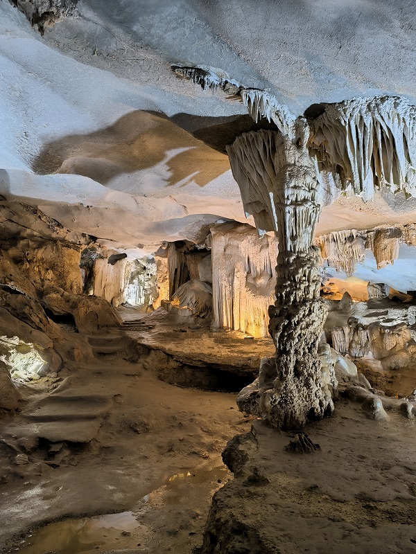 Chụp hình không dễ vì ngoài đoàn chúng tôi còn nhiều đoàn khác. Đầu cổ lúc nhúc, smartphone tứ bề. Dưới chân và trên vách hang toòng teng dây nhợ vì họ bắt điện để có chút ánh sáng nhưng lại không khéo che.