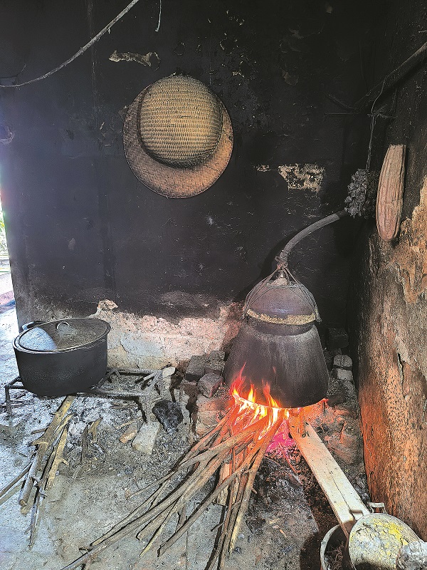 Sau bữa cơm trưa có nem rán bánh đa nghệ, bò quấn lá lốt, nộm hoa chuối, canh bí đỏ nấu đậu xanh, xôi nếp nương đồ lá cẩm, trà sả pha mật ong rừng, rượu nhàu… trong khu vườn rộng phủ bóng khế, bưởi, nhãn trĩu quả trên cây của cô Chín người Mường, chúng tôi đạp xe đi thăm vườn trà, xưởng nấu rượu, xưởng làm đậu phụ, đan nón lá, rèn dao v.v.