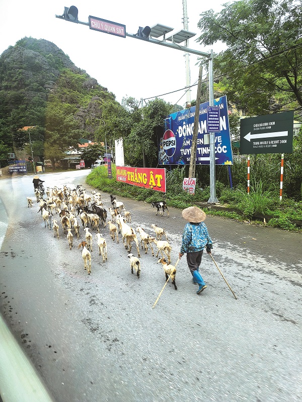 Ba Vì cách Hà Nội 70 cây số, tức khoảng một tiếng rưỡi ngồi xe hơi. Trên đường đi, chúng tôi nhìn thấy nhiều đàn dê băng ngang đường cái. Xe chạy ngang sông Đà và nhiều cây cầu có tên rất hay như cầu Bài Văn, cầu Đào Nguyên, cầu Đan Hoài… ngang nhiều đồng quế, nương dong, ruộng đậu phọng, trung tâm nghiên cứu bò, cơ sở đá ong, khu du lịch sinh thái v.v. và hàng hà sa số dịch vụ thương mại nối tiếp nhau như «Sữa dê bất bại», «Trâu giật – Tinh lợn» «Chườm ngải – Ngâm chân», «Trâu tươi – Gà đồi» «Cá sông – Dê núi», «Gà đẻ – Chỉ tơ» «Bún chó – Lẩu mèo», «Gội đầu – Triệt lông», «Chà gót – Uốn mi», «Cắt tóc – Lấy ráy», «Xì khô – Hút bụi», «Làm lốp – Sửa vành», Make-up, bridel, xát gạo, ép kính, tẩy la răng, đọc xóa lỗi cài đặt, tư vấn phong thủy, nấu cỗ trọn gói, cẩu tải thuê, pickleball, phục vụ team building, số sim đẹp, gội đầu dưỡng sinh, giặt là lấy ngay v.v. Tất cả đều toát ra năng lượng sống «Mạnh mẽ, quyết tâm và quyết liệt» như lời một khẩu hiệu.