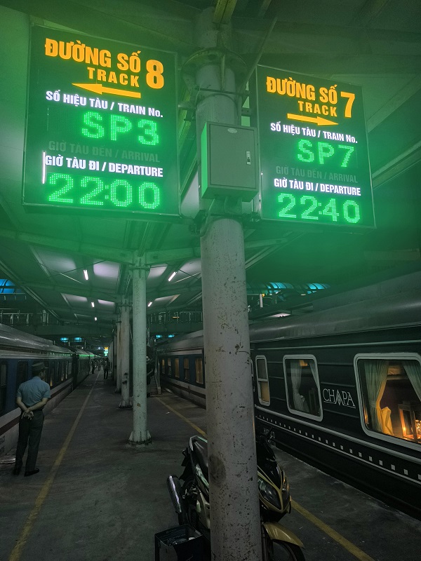 Các anh Tây chân dài nằm thòi chân khỏi couchettes. Chiếc gối có vết ố vàng, tôi lấy áo khoác trùm lên để tự giúp mình làm ngơ. Đêm không êm vì gió bão hay vì tình trạng đường rầy xấu không rõ, con tàu lắc lư dữ dội, có lúc tưng tưng như thể chạy trên lò xo, có lúc bị cành cây ven đường quật mạnh lên nóc. Mãi gần 4 giờ sáng, tôi mới chợp mắt thì 6 giờ bị nhân viên gọi dậy. Họ đến gõ cửa từng buồng, chào lớn: «Good Morning!» Ngay sau đó, loa phát lớn bể lỗ nhĩ bài hát ca ngợi Lào Cai quê em. Liên tục chương trình là bản tin tuyên truyền chủ trương của Đảng và nhà nước, kêu gọi «Trí tuệ tập thể phát triển đất nước, đưa GDP lên cao hơn nữa, tiến tới xây dựng nhà máy hạt nhân, chú trọng xây dựng kỹ thuật số, khiến Việt Nam trở thành quốc gia giàu nhất nhì Châu Á… ».
