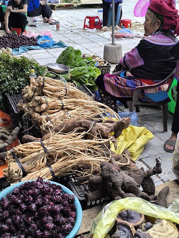 Vào sâu trong chợ, tôi bắt gặp nhiều thứ đã biết như ớt, quế, hồi, sả, bồ kết… cùng hằng hà sa số hoa củ quả mới nhìn thấy lần đầu như hạt dổi, nghệ đen, gừng gió, củ mài, củ rày, củ dòm, rễ đinh lăng, nấm lim, táo mèo, na rừng, me rừng, v.v… Mấy người bạn Pháp le lưỡi khi nhìn thấy gà đen còn nguyên móng giơ chân chỉ thiên bên đầu dê nhe răng, tai lợn, đuôi bò, lòng ngựa tươi sống, trứng gà non và tinh hoàn con gì chả biết, từng chùm, từng hòn bày ra nhan nhản… Không ai dám ăn thử Nậm bò, Thắng Cố, trừ anh.
