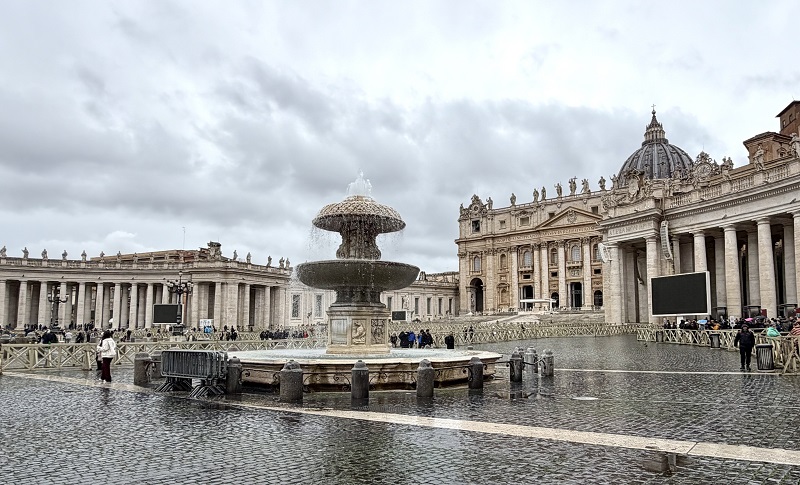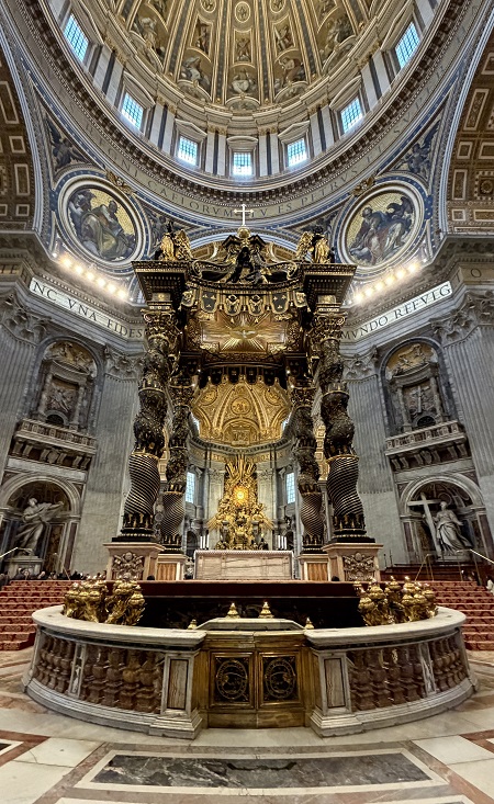 Rời khu vực Colosseum, đón xe tới Vatican, một quốc gia độc lập nhỏ nhất thế giới, nằm gọn trong lòng Rome nhưng mang sức ảnh hưởng khổng lồ, vì đây là trung tâm của Giáo hội Công giáo, nơi lịch sử, quyền lực và nghệ thuật hội tụ. Ngay từ xa, mái vòm khổng lồ của Vương cung Thánh đường Thánh Phêrô đã hiện lên, sừng sững và uy nghi, như một lời mời bước vào không gian của sự tĩnh lặng và chiêm nghiệm. Bên trong, ánh sáng len qua các ô cửa sổ, hắt xuống những bức tượng khổng lồ, tạo ra một cảm giác gần như thần thánh. Đứng trước mái vòm vĩ đại, một tác phẩm của Michelangelo, nhìn những đường cong hoàn hảo và từng chi tiết tinh xảo, người ta có thể tự hỏi làm sao con người có thể tạo ra thứ gì vừa mạnh mẽ vừa tinh tế đến vậy.