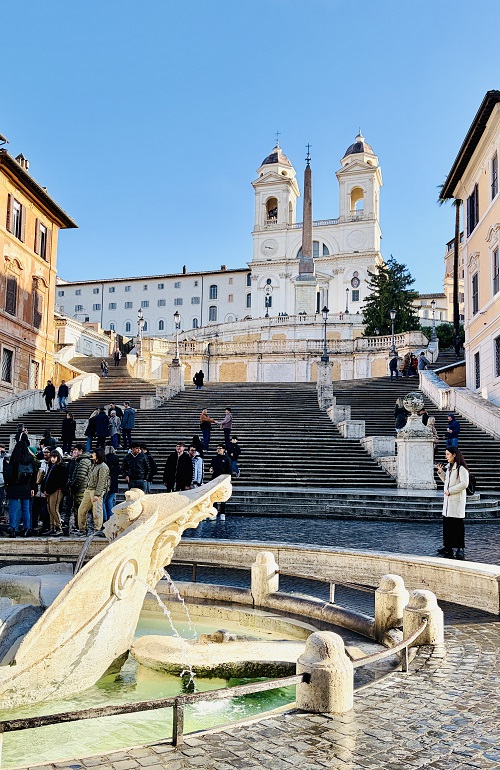 Từ Vatican chúng ta đón xe đến trạm Spagna và tới quảng trường Piazza di Spagna, một trong những quảng trường nổi tiếng nhất của Rome. Từ xa, cầu thang Tây Ban Nha dẫn lên Trinità dei Monti, nhấp nhô như mời gọi bước chân của du khách và người dân địa phương. Những bậc thang đá trắng phản chiếu ánh nắng, và mỗi bước đi đều khiến bạn cảm nhận nhịp sống năng động nhưng cũng đầy thanh lịch của Rome. Piazza di Spagna, tên tiếng Anh là Spanish Steps, vì từ thế kỷ 17, tòa đại sứ Tây Ban Nha được nằm tại quảng trường này, nên người La Mã gọi khu vực này là “Spagna”, nghĩa là Tây Ban Nha, và dần dần tên gọi này được lan sang các bậc cầu thang nối quảng trường với nhà thờ Trinità dei Monti ở trên đồi.