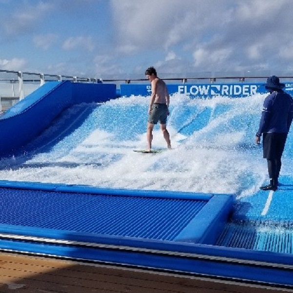 Flowrider: hình như lúc nào cũng có người chơi, nhìn cũng vui. Nước chảy ào ào từ trên dốc cao xuống thấp. Một người đứng trên tấm ván mỏng điều khiển thế nào để khỏi bị té. Trò chơi này nhiều nam nữ tham dự nhưng phần lớn là nam. Có huấn luyện viên đứng bên cạnh dòng nước, sẵn sàng giúp nếu ai bị ván lật, té xuống nước. Vân thích xem thiên hạ chơi trò thể thao này. Không thấy trẻ em tham gia, thấy toàn người lớn tham dự mà thôi.