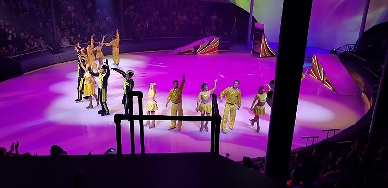 Trượt tuyết: Muốn xem trượt tuyết cũng phải ghi danh vì chỗ ngồi hạn chế, không đủ chỗ cho tất cả du khách. Lúc mới đầu rõ ràng là các nghệ sĩ trượt trên sân tuyết nhưng chớp mắt sân tuyết biến thành sân đá hoa màu hồng xen lẫn màu trắng hay màu xanh lá cây hoặc toàn sân là hoa hướng dương rất đẹp. Các nghệ sĩ thay đổi y phục rất nhanh, màu sắc tươi vui xinh xắn. Cả chục người trên sân khấu. Họ xếp thành hàng ngang, hàng dọc, thành hình đóa hoa, nhẹ nhàng, điêu luyện vui mắt. Khán giả nhiệt liệt vỗ tay tán thưởng.
