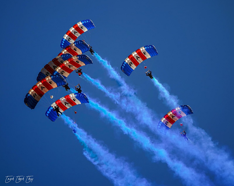 Không ai có thể quên được những cánh dù màu đỏ rực pha xanh lục dàn thành đội hình lửng lơ trên không trung với từng lọn khói màu làm rực rỡ cả bầu trời. Đội dù Hoàng Gia Anh Royal Air Force Falcons Parachute vững chãi xếp thành những đội hình khác nhau. Lúc thành hình thoi, khi hình bầu dục, khi đan xen, lúc chập vào nhau đủ mọi hình dạng, mọi kỷ hà, vô cùng ngoạn mục. Đẹp quá những cánh dù vương giả của Anh Quốc, Âu Châu. Là lần đầu tiên xuất hiện tại Triển lãm Hàng không Thái Bình Dương Huntington Beach này, họ trực tiếp đến từ Căn cứ Không quân Hoàng gia Brize Norton, Oxfordshire và là đội bay biểu diễn dù hàng đầu của Vương quốc Anh, RAF Falcons. Là đơn vị biểu diễn chính thức của Không quân Hoàng gia, là một huyền thoại đại diện cho đỉnh cao của hiệu suất và niềm tự hào. Nổi tiếng với đội hình rơi tự do đáng kinh ngạc và khả năng điều khiển vòm dù chính xác, đội bay Falcons tô điểm bầu trời thành một bức tranh đủ màu sắc vô cùng sống động. Mỗi thành viên trong đội đều là Huấn luyện viên Nhảy dù ưu tú, được đào tạo để hỗ trợ các lực lượng chuyên nghiệp nhất của Vương quốc Anh, bao gồm Trung đoàn Nhảy dù và Thủy quân Lục chiến Hoàng gia.