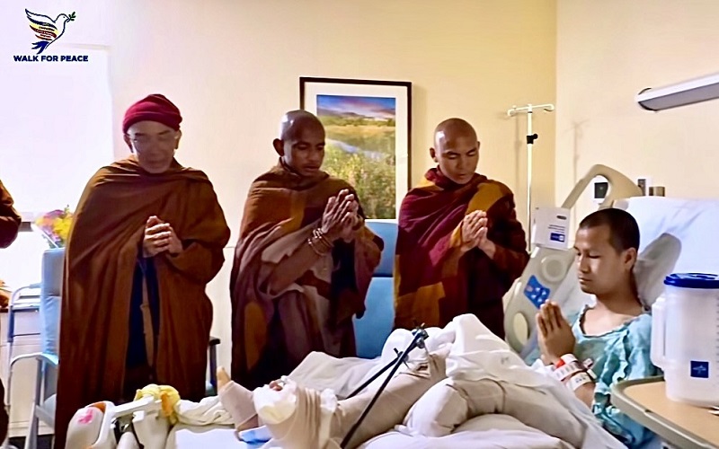 Sư Tuệ Nhân cùng Tăng đoàn đến bệnh viện Memorial Hermann thăm Sư Venerable Dam Phommasan. Nguồn: Bước Chân Hành Giả