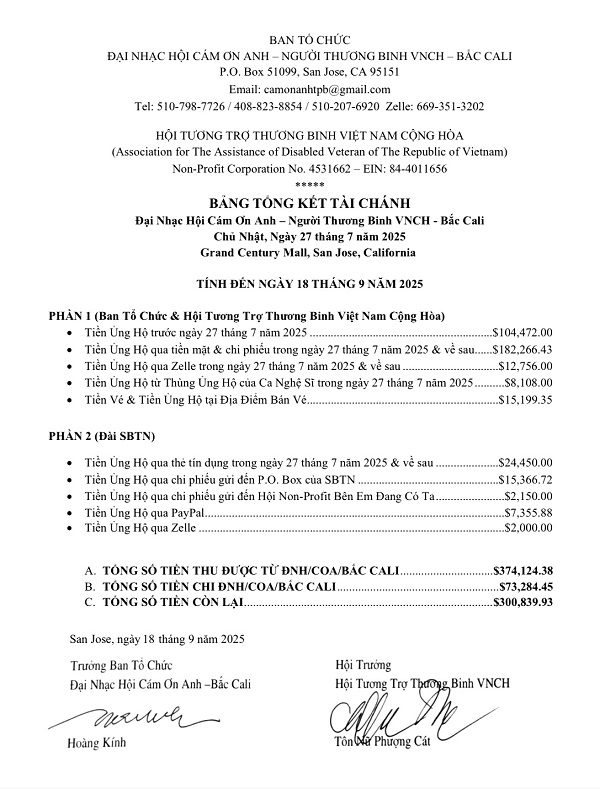 Điều kiện này cũng được đặt ra trong hầu hết các tổ chức gây quỹ cứu trợ TPB ở khắp mọi nơi trên thế giới mà tôi đã và đang tiếp tay. Từ Canada đến Úc châu, Âu châu và các thành phố, tiểu bang ở Hoa Kỳ. Trong tinh thần đó, ngày hôm nay chúng tôi xin hân hạnh chia sẻ đến quý vị Bảng Tổng Kết Tài Chánh của buổi Đại Nhạc Hội “Cám Ơn Anh, Người Thương Binh VNCH”, diễn ra tại San Jose, California vào ngày Chủ Nhật, 27, tháng Bảy, 2025 do Hội Tương Trợ Thương Binh VNCH tổ chức.