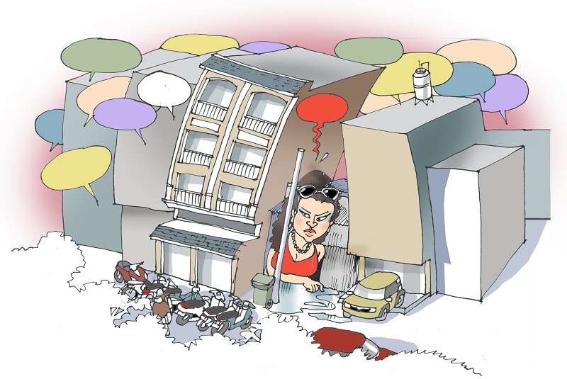 Tôi chợt nhận ra, khi mình cố giữ lấy nếp sống bình thường ở đây, mình bỗng trở thành “kẻ ác” trong mắt những người đã quen sống trong sự nhếch nhác có hệ thống. Tôi cũng phải thừa nhận là tôi đã khuấy đục dòng “nước (đối với họ là…) trong” của “khu dân cư cao cấp” này. Nhưng, thông cảm, tôi – cái “nhân bánh” này – tiếc tiền đặt cọc, cũng hơi tiếc cái khung cảnh im lặng trong nhóm chat của tổ dân phố… Nên, dĩ hòa vi quý hả? Được thôi, nhưng trước hết hãy trả lại cho tôi cái quyền được đi lại, được nhìn thấy một hàng hiên sạch sẽ, và quan trọng nhứt, là cái quyền không phải nhìn thấy những “mỹ cảnh” uốn lượn trước hiên nhà mỗi đêm mưa…