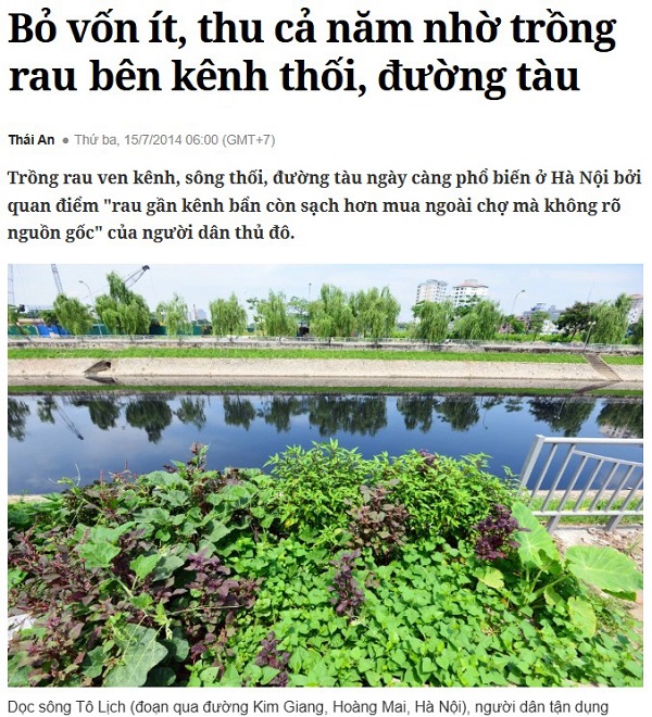 “Trồng rau ven kênh, sông thối, đường tàu ngày càng phổ biến ở Hà Nội bởi quan điểm ‘rau gần kênh bẩn còn sạch hơn mua ngoài chợ mà không rõ nguồn gốc’ của người dân thủ đô.”