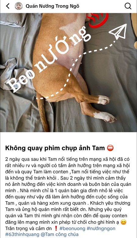 Một chú chó ở Hà Nội bỗng nổi tiếng, khiến quán nướng của chủ của chú chó nổi tiếng, nhưng người chủ thấy như vậy không ổn – Nguồn: Facebook