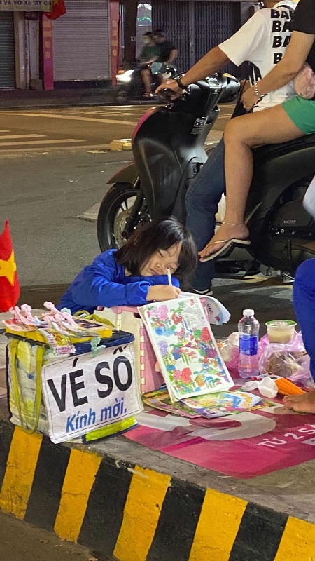 Và, vô số lần đi ngang cây xăng ngay ngã tư Pasteur – Võ Thị Sáu, là vô số lần tôi luôn thấy hai mẹ con bán vé số ngồi học bài giữa tiếng xe cộ. Bé viết từng chữ nắn nót. Có khi học mệt, bé gục ngủ trên bàn nhựa, tay vẫn cầm cây bút. Ai cho tiền, hai mẹ con không nhận, chỉ mời mua vé số. Nếu là sách vở, bút màu, họ mới nhận. Một người mẹ bình luận: “Ngày trước mình hay nói với con mình rằng học không tốt cho đi bán vé số. Cho tới gần đây mình mới biết một phụ huynh trong lớp con mình đi bán vé số thật và bé con của chị ấy học rất tốt luôn. Mình nhận ra việc lôi những việc lao động chân tay ra để hù dọa con là một điều rất tệ vì không phải ai làm nghề đó cũng đều lười học, có khi họ không có được một cơ hội học tập tốt thôi.”