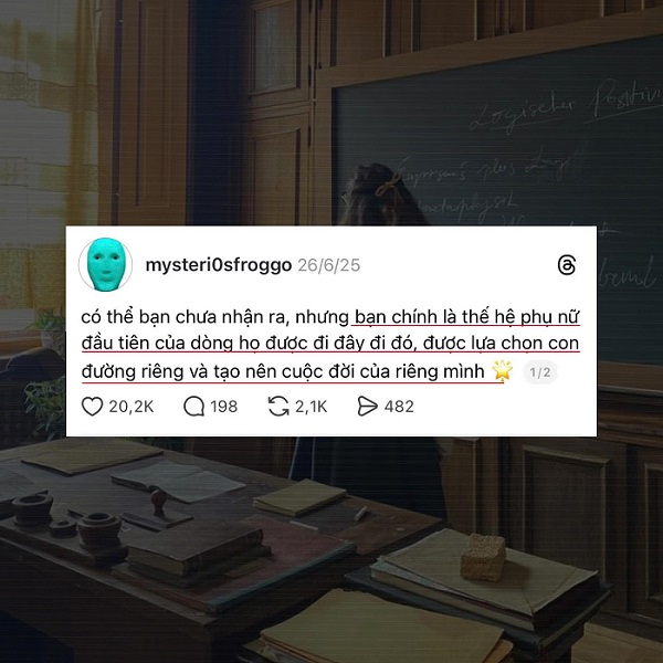 “Có thể bạn chưa nhận ra, nhưng bạn chính là thế hệ phụ nữ đầu tiên của dòng họ được đi đây đi đó, được lựa chọn con đường riêng và tạo nên cuộc đời của riêng mình.”
