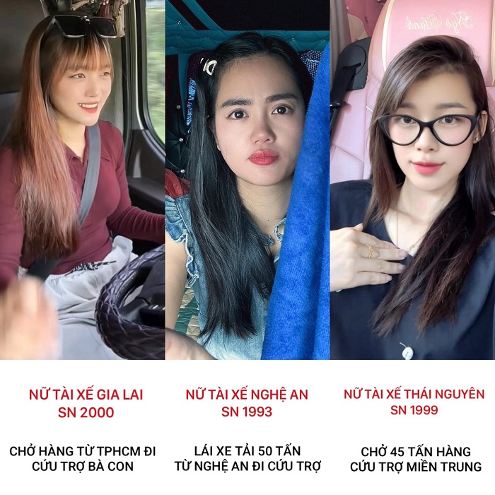 3 nữ tài xế xinh đẹp lái những chiếc xe trọng tải nặng, vượt hàng trăm km, chở hàng chục tấn hàng cứu trợ bà con vùng lũ – Nguồn: Facebook