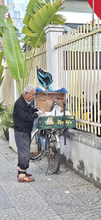 “Nhiều thanh niên, trung niên nam nữ đi bán vé số, lượm ve chai…Anh thấy đó, xã hội này mà không chịu khó lao động là đói. Đừng có chờ ai cho mình hết!”, ông Bảy cảm thán. Tôi hỏi mua một cây kẹo ăn thử. Té ra ông không kéo kẹo mà lôi ra một bọc ni-lông đựng kẹo đã kéo sẵn, vô bao. Ông giãi bày: “Lần nớ đang kéo kẹo bị xe máy phía sau tông té. Nay còn ê cái đầu. Nên mới giảm kéo kẹo một thời gian. Tôi kéo trước ở nhà cho chắc, vô bao sạch sẽ, lịch sự. Kẹo tôi nấu bằng mạch nha Quảng Ngãi nên ăn nó mềm… Có người nấu đường nặn thêm chanh vô để khỏi lại đường nên kẹo đôi khi cứng, không ngon… Ngày bán hết 3 gói, 70 cây, thì lời được gần 200,000 đồng! Bán không hết, ế ế cũng lời được 120 nghìn đồng. Để lại mai bán, chớ hắn có hư hỏng chi mô! Xin phép anh, tôi phải đi cho kịp giờ học sinh ra chơi!”. Ông lại hối hả đạp xe đi… Cứ sáng 8 giờ đi, chiều 5 giờ về. Canh đến giờ ra chơi của vài trường học, ông đến đó bán.