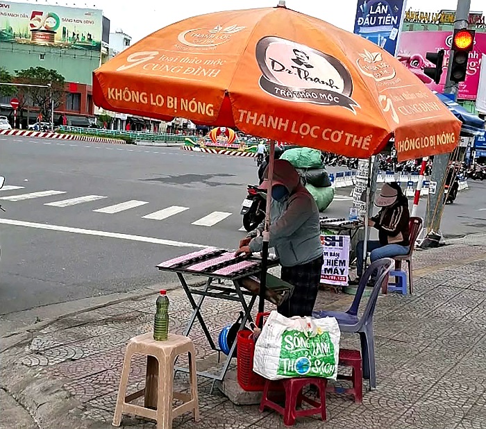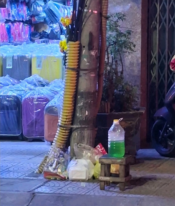 Góc ngã tư đường Hoàng Hoa Thám – Lê Duẩn, phường Thanh Khê, có đến 3 “Cây xăng cục gạch”, hai cây xăng bán từ sáng đến tối. Anh H. chuyên vá xe, sạc bình điện, thay nhớt đã mười mấy năm. Nhưng kèm “Cây xăng cục gạch” thì mới… hoạt động từ cuối năm 2025. Anh chia sẻ: “Ba giờ chiều mới đẩy xe ra. Đến 11 giờ đêm dọn đồ về. Ngày bán nhiều cũng được 3 lít, kiếm thêm 30,000 đồng. Em bán đúng y lít. Có người bán vẫn giá đó nhưng không đủ lít”, anh H… tố giác. Như bà Th. bán báo kèm bán “Cây xăng cục gạch” trên đường Hàm Nghi thì chai chỉ bán 25,000 đồng. Bà nói do cái chai mình “yếu” (0.8 lít) nên lời vậy cũng được rồi. Có ngày chẳng bán được lít nào là bình thường. Để đối phó với bọn người xấu chạy xe ngang qua như gió, thó (lấy cắp) mất, người bán bèn…tổ chức ngụy trang. Đặt chai nước trên cái ghế nhựa nhỏ hoặc trên vài cục gạch… rồi hòa một ít nước rửa chén cho có màu lai lai như xăng. Có khi dùng chai nhựa đựng toàn nước. Để chắc ăn, vài “Cây xăng cục gạch” có bao lưới sắt, trên chận mấy cục gạch to. Giá bán của “Cây xăng cục gạch”… chạy rượt theo giá xăng cây của các doanh nghiệp trồi sụt thất thường. Cách nay hơn 20 năm, bán một lít lời 2,000 – 3,000 đồng. Dần dần lên 4,000 – 5,000 đồng. Nay, năm 2026, giá xăng cây hiện nay gần 19,000 đồng – 20,000 đồng/lít thì “Cây xăng cục gạch” bán 30,000 đồng… cho chẵn! Người bán xăng lẻ đã tính hao hụt do xăng bay hơi, do sang qua sớt lại, công đi mua này nọ… vô một rổ!