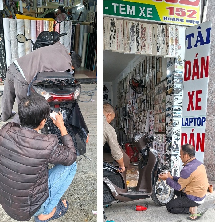 Từ năm 1995 đến năm 2000, cửa hiệu “Dán keo bảo vệ nước sơn các loại xe mới” của anh Qu. trên đường Hoàng Diệu rất hút khách. Nghe đâu anh đã định cư ở Mỹ. Vài lần tôi đi ngang đều thấy khách ngồi chờ đến lượt dán xe. Không chỉ khách hàng của thành phố mà còn khách hàng từ các huyện Điện Bàn, thị xã Hội An, Tam Kỳ… lúc ấy tìm đến nơi uy tín trao xe cho dán. Anh Quý chọn loại băng keo lâu bong tróc, dán kín mí, cẩn thận. Nếu có vấn đề thì sẵn sàng lột ra, dán lại, Chuyện trục trặc chỉ họa hoằn mới xảy ra. Thường thì khách mang xe đến dán đã… đi thực tế, tới ngắm nghía thợ thao tác, hỏi thăm giá cả… Do khách kỹ tính, sợ dán keo ngoài đường bụi bặm thì thợ đưa xe vô bên trong. Hiệu dán keo xe máy L.T. trên đường Hùng Vương xuất hiện đầu tiên ở Đà Nẵng cũng sẵn sàng cho thợ tới phục vụ khách tại nhà hoặc cơ quan nếu có nhu cầu!