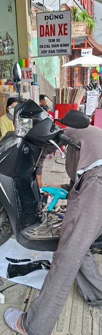 Tôi hỏi chuyện, một chủ hiệu than thở, ngày dán được ba, bốn chiếc, có ngày không chiếc nào. Tiệm nay chỉ còn một thợ, chủ cũng xắn tay ra phụ. Nhu cầu của khách ngày càng sụt giảm, không sôi nổi như trước kia, xe phải xếp hàng. Thợ dán xe cũng theo thời thế mà nhiều người xin nghỉ việc, chuyển đổi nghề. Rất ít người dán xe vỉa hè còn cầm cự. Chủ cửa hàng nào có vốn khá thì còn hoạt động… cầm chừng. Vừa dán xe vừa bán keo dán, nhận dán thêm đề-can trang trí tường nhà, văn phòng cả dán màn hình laptop, điện thoại…