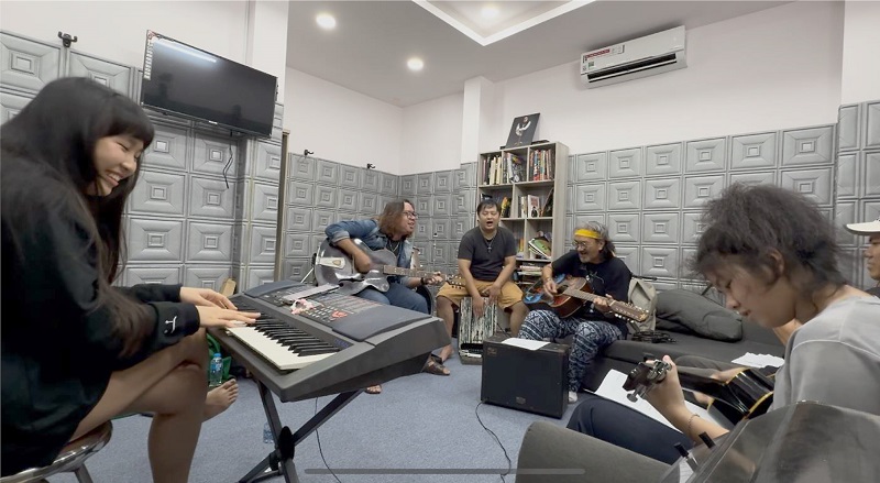 Cả bọn đang tập bài Hey Jude tại studio của thầy Viễn Huỳnh, thứ hai từ trái. (IANBUI/TRẺ)