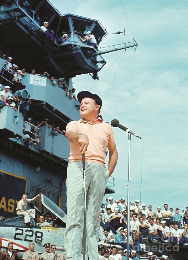 Bob Hope giúp vui cho binh sĩ trên một chiếc chiến hạm ngoài khơi Biển Đông. (U.S. Navy)