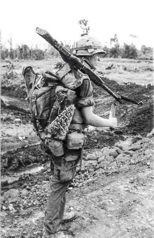 Binh nhất Frank N. Bunton cùng cây thông Noel đi tuần gần Côn Thiện, 12/1967. (NARA)