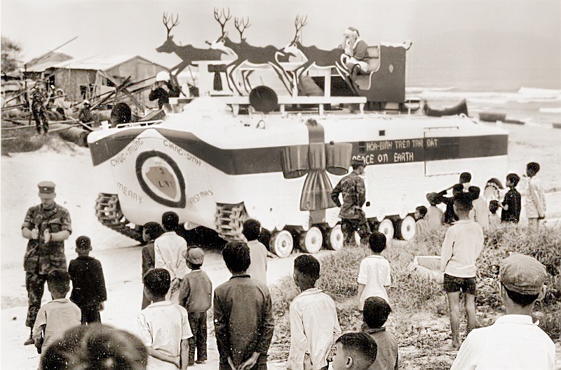 TQLC Mỹ mang quà cho trẻ em tại một làng chài miền Trung trên một chiếc LVTP-5 được trang trí thành chiếc xe kéo của ông già Noel, 12/1969. (NARA)