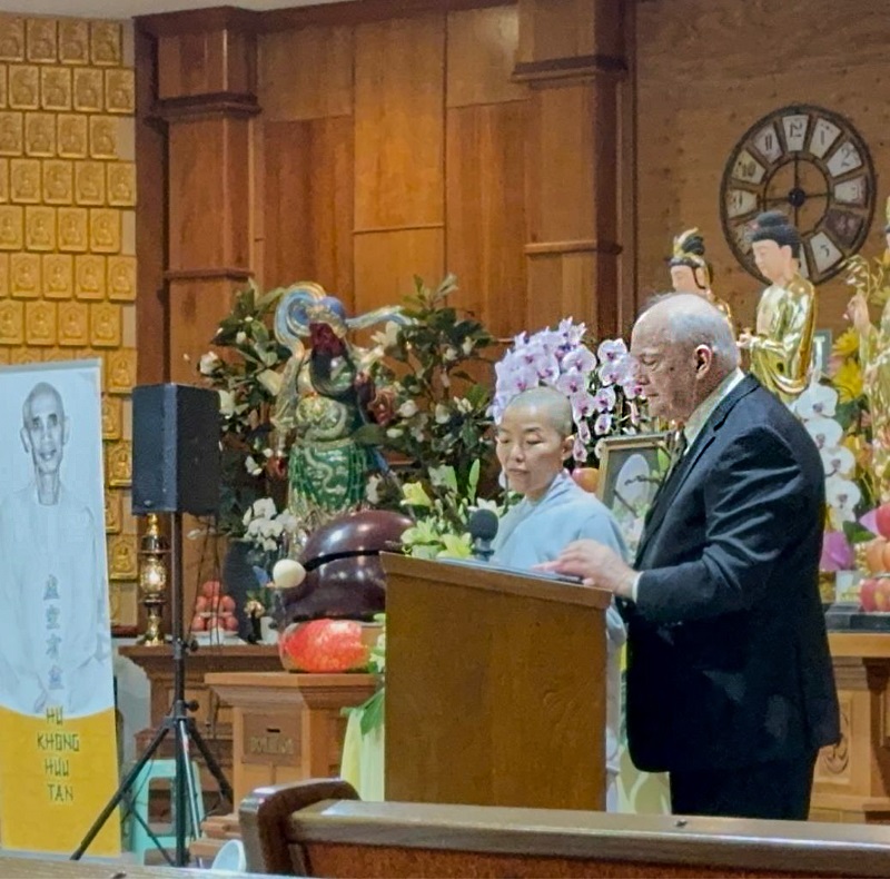 Trong số các diễn giả trong chiều thơ ấy có giáo sư Phil Stanley đến từ đại học Naropa University tại Boulder, Colorado. Ông là một dịch giả và học giả uyên thâm về Phật giáo Tây Tạng, chuyên dịch các kinh bản từ tiếng Tây Tạng sang tiếng Anh. Bài nói chuyện của ông, được phiên dịch tại chỗ bởi sư cô Hạnh Thân (trái), tuy ngắn gọn nhưng vô cùng súc tích. Trong bữa cơm chay sau lễ, người viết có dịp bắt chuyện với ông và được nghe ông tự sự: “Tôi chỉ là một người phi tôn giáo, nhưng rất yêu thích Phật pháp.”’