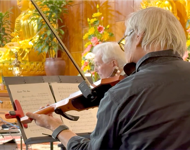 Ngoài ra, bài Đạo Ca 1 “Quán Thế Âm” do chị Ái Phương hát mở đầu chương trình cũng rất hay. Nhưng ấn tượng nhất đối với người viết là bài Đạo Ca 2 “Đại Nguyện” do chị Hồng Hạnh đến từ San Diego trình bày, với một giọng hát mạnh mẽ nhưng mượt mà. Ban nhạc cây nhà lá vườn hôm đó tuy đơn sơ nhưng ngọt, với tiếng đàn violon của anh Đặng Tiến Kính (phải) và guitar thùng của anh Hùng Ngô (trái). Đáng tiếc là phần đọc thơ Tuệ Sỹ của anh Trần Trung Đạo (kiêm trưởng ban tổ chức) cũng như một số nhạc phẩm khác đã bị cắt vào giờ chót do phần diễn thuyết chiếm hết thì giờ. Tuy nhiên, bài nói chuyện của Sư cô Khánh Năng, đệ tử 20 năm của thầy Tuệ Sỹ, hết sức chân tình và là điểm son của buổi chiều hôm ấy.