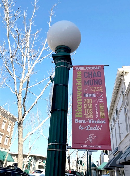 Banner chào đón khách thập phương tại Old Downtown Lodi. (IANBUI/TRẺ)