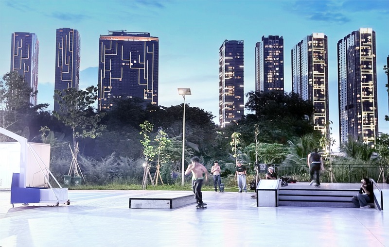Thanh thiếu niên tập chơi skateboard bên cạnh sân pickleball ở Quận 2. (IANBUI/TRẺ)