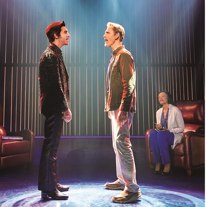 Neil Diamond trẻ (Nick Fradiani) trực diện Neil Diamond già (Robert Westernberg) trong văn phòng bác sĩ tâm lý (Renée Pitts). (Jeremy Daniel/Broadway Dallas)
