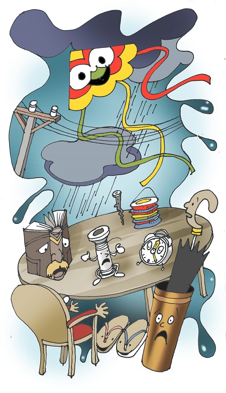 Như mọi vật biết đấy, bọn dây điện đâu có ưa gì nhau. Vừa chạm mặt là chúng hét lên, lửa xanh, lửa đỏ tung toé. Chỉ đứt luôn! Cậu bé cầm tôi chạy thẳng, anh Diều bị giam cứng trên đó.