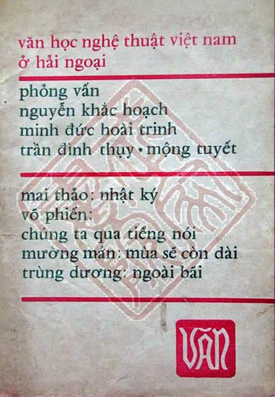 Với số lượng tạp chí nhiều như thế, sẽ không điểm hết, nên tôi chọn số phát hành 26/3/1975 ( tạp chí này không có số thứ tự, vì thời điểm ấy chế độ miền Nam, chỉ cho xuất bản Giai Phẩm ), trước để biết dấu ấn về tọa độ thời gian, sau tò mò xem các tác giả bày tỏ gì trong ấy; đây là số cuối cùng mà Văn đã bị làm xong nhiệm vụ lịch sử. Bìa 1 trình bày toàn chữ rất đơn giản rõ ràng, màu thời gian tác động lên bìa sách chữ còn chữ mất, chữ đỏ phần đặc biệt Văn Học Nghệ Thuật Việt Nam ở hải ngoại. Ở phần mục lục: Phần Đặc Biệt về Văn Học Nghệ Thuật VN ở Hải Ngoại: Phỏng vấn giáo sư Nguyễn Khắc Hoạch, nữ ký giả Minh Đức Hoài Trinh, nữ sĩ Mộng Tuyết, họa sĩ Trần Đình Thụy; Phần Văn Xuôi có văn của Mai Thảo, Võ Phiến, Trùng Dương, K.T. Mohamed, Lê Huy Oanh, Mường Mán; Phần Thơ có thơ của Nh. Tay Ngàn, Bùi Đức Long, Trần Hồng Châu, Ngô Cang, Tạ Hiền; và các phần Sinh hoạt văn nghệ, Ở phần văn xuôi là Nhật Ký của Mai Thảo ghi mềm mại những sự việc từ 15.2.75 đến 20.3.75, đọc lại vẫn bùi ngùi, bút pháp đằm thắm đầy lãng mạn, xin trích phần cuối của nhật ký “…Đêm vẫn còn là nhiều so với thời kỳ giới nghiêm sau Tết Mậu Thân. Hệ thống kẽm gai cấm đường ném chi chít trên những mặt nhựa Sài Gòn hồi đó từ 6 giờ chiều. Phố xá vắng ngắt lúc chưa tàn nắng…”. còn Võ Phiến tiếp tục loạt bài Chúng Ta Qua Tiếng Nói với tiêu đề Tiếng Nói, Một Phương Tiện? Võ Phiến bao giờ cũng vậy, kỹ lưỡng, câu chữ chắc chắn chi tiết chắt lọc; nhà văn Trùng Dương có truyện ngắn Ngoài Bãi, bây giờ nữ văn sĩ đã ở ngoài bãi bên kia Thái Bình Dương; nhà văn Ấn Độ K.T. Mohamed với truyện ngắn Đôi Mắt Mùa Xuân do nhà thơ Hoàng Trúc Ly chuyển ngữ; nhà văn Lê Huy Oanh nhận định Bùi Gáng Nguồn Cảm Hứng trong Thơ Việt (sau khi đã nhận định hai cõi thơ Nguyên Sa và Nhã Ca): “Bùi Giáng đập phá bằng cách đùa cợt những tư tưởng cổ truyền, bằng cách đùa cợt chính ông, bằng cách bôi lem thơ, làm xô lệch ngôn ngữ…”; và truyện ngắn Mùa Sẽ Còn Dài của “nhà văn trẻ Mường Mán. Ở Phần Thơ thì khởi đầu là thơ của Nh. Tay Ngàn trải những bài thơ tự do dài viết ở Paris, vẫn ám ảnh hình bóng Liên Mà thương quá em Liên, năm 1988 Phạm Công Thiện viết cuốn Đi Cho Hết Một Đêm Hoang Vu Trên Mặt Đất nói bạn tôi (tức Nh. Tay Ngàn) mất tháng 1/1978 tại Paris, bây giờ sau 33 năm Thiện cũng ra đi khỏi trần ai, Ngày 8/3/2011 Phạm Công Thiện đi, tôi có mấy dòng: