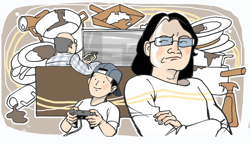 Một bà mẹ (U 50) có tính rất chu đáo, (và cả ôm đồm) việc nhà cửa một tay bà lo toan từ A đến Z, từ cái chén ăn cơm cho đến cả việc lên kế hoạch sắm sửa lớn; không phải ông chồng vô tâm, nhưng vì bà lo quá nhiều nên ông phải bớt lo đi một chút. Nếu cả hai cùng lo, mà người này lo không đúng ý người kia thế nào cũng “đụng trận”, nhiều khi đến toé lửa. Ông nói, tính bà ấy hay lo, tôi mà xía vào, không đúng ý bà ấy nhiều khi lại hỏng chuyện