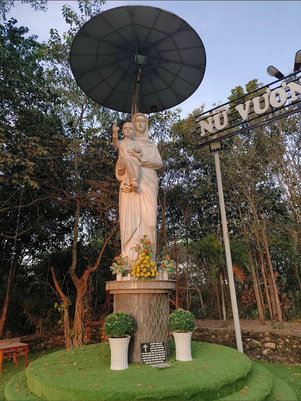 Ở đây mọi người gọi vui Cha chánh xứ là “ông ngoại.” “Sự tích” chức “ông ngoại” là bởi vì đây là nhà thờ Mẹ Thiên Chúa, Cha của Mẹ Thiên Chúa thì là “ông ngoại” chớ gì nữa. Trong khi ăn, ngài kể nguồn gốc bức tượng Đức Mẹ mới dựng. Ngài nói đại ý là bà Xuân đem từ Pháp về 3 bức tượng, dựng được 2 bức tượng rồi thì xảy ra chính biến, Tổng thống Ngô Đình Diệm và ông Ngô Đình Nhu bị sát hại, bà Nhu bị kẹt ở nước ngoài. Bức tượng Đức Mẹ thứ 3 bị nằm trong nhà kho của nhà thờ từ dạo ấy tới nay nhưng không ai biết đó là gì, trừ “ông ngoại,” vì tượng gồm nhiều mảnh chưa được lắp ghép. Sau 1975 thì các công trình xây dựng của Công giáo “không được cấp phép” (nói trắng ra là ngầm cấm.)