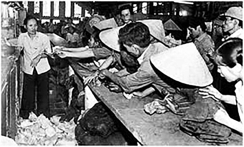 Cảnh mua hàng tem phiếu tại một cửa hàng mậu dịch nhà nước ở miền Bắc trước 1975