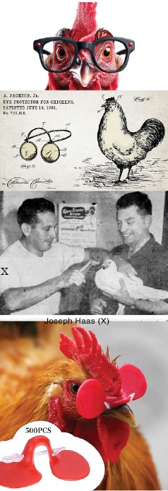 Năm 1939, Joseph Haas (người sáng lập National Band & Tag Company) sáng chế ra phiên bản cải tiến nổi tiếng của kính cho gà – Anti-Pix (hay còn gọi là Chicken Sunglasses/rose-colored glasses). Khi gà cúi đầu ăn, kính sẽ nâng lên để nhìn rõ; còn khi ngẩng đầu, tức tư thế thường dùng để tấn công, kính sẽ rơi xuống che khuất tầm nhìn thẳng, khiến nó mất khả năng ước lượng khoảng cách để mổ chính xác. Người ta còn quảng bá rằng màu đỏ hồng giúp che màu máu để gà bớt mổ nhau. Tuy nhiên, về sau, ông Elmer Haas, giám đốc công ty, thừa nhận chuyện “che màu máu” chủ yếu là lời quảng cáo cho chủ trại yên tâm, vì thật ra mắt gà vẫn phân biệt màu khá tốt. Năm 1955, một nhà sản xuất từng nói trên chương trình CBS rằng họ bán được từ 2 đến 3 triệu cặp mỗi năm. Tới năm 1973, một nông dân ở Illinois còn gắn loại kính này cho 8,000 con gà. Hướng dẫn của bang New York cũng cho biết loại dụng cụ chống mổ này khá hữu ích khi nuôi số lượng lớn, nhưng người gắn phải có kinh nghiệm để làm cho đúng cách.