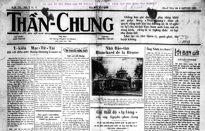 Tờ báo Thần Chung mà anh chạy tin hồi năm nẳm, em nhớ hồi em còn nhỏ lúc hiệp định “Giơ Neo Vờ” ký kết chia đôi đất nước hồi năm 1954, cả cái xóm mình xúm nhau ngồi chung quanh bộ ngựa gõ mốc thít vì hồi tản cư Tía em giấu dưới hầm cá vồ, để nghe anh năm Tờn đọc báo. Lúc đó, ai ai cũng trầm trồ những tấm hình ảnh chụp đăng trên báo cảnh bà con xôn xao khi nghe tin đình chiến với vẻ mặt vui buồn lẫn lộn cùng binh lính Pháp tàu bè rút tuốt về Tây. Bà con xóm mình nói hình của anh Hai tụi bây chụp đó.