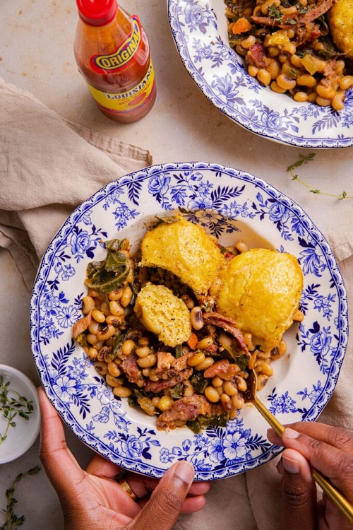Đậu (Black-eyed peas), rau xanh (greens) và bánh ngô (corn bread). Những người đến từ Nam Hoa Kỳ (Southern United States) tin rằng đây là những món ăn mang lại may mắn trong ngày đầu năm; bởi đậu tượng trưng cho những đồng xu (peas for pennies), rau xanh tượng trưng cho tiền (greens for dollars) và bánh ngô tượng trưng cho vàng (corn bread for gold). Món ăn được chế biến từ những nguyên liệu đơn giản, sẵn có trong mùa này rất dễ làm, rẻ tiền nhưng ngon miệng và tốt cho sức khỏe.
