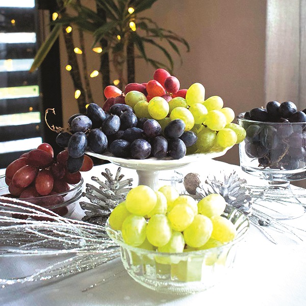 Nho. Người dân Tây Ban Nha và Mexico tin rằng ăn 12 quả nho vào lúc nửa đêm khi đồng hồ điểm mỗi tiếng một giờ sẽ mang lại may mắn trong suốt 12 tháng tới (mặc dù việc này không hề dễ như bạn nghĩ). Nho là loại trái cây ngon rất xứng đáng để có mặt trên bàn ăn vào ngày Lễ.