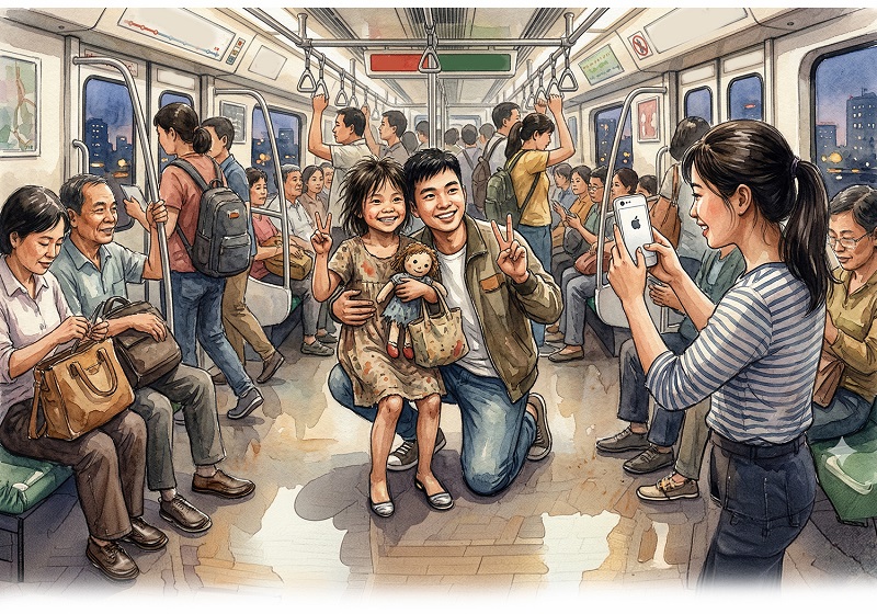 Trên chuyến tàu điện ngầm chật kín, một cô bé khoảng tám tuổi ngồi nép mình bên cửa sổ. Bỗng em quay đầu, nhìn chằm chằm vào chàng trai trẻ ngồi cách đó hai ghế. Sau vài giây ngập ngừng, em cầm con búp bê cũ và chiếc túi vải bạc màu, rón rén bước tới, kéo nhẹ tay áo anh.