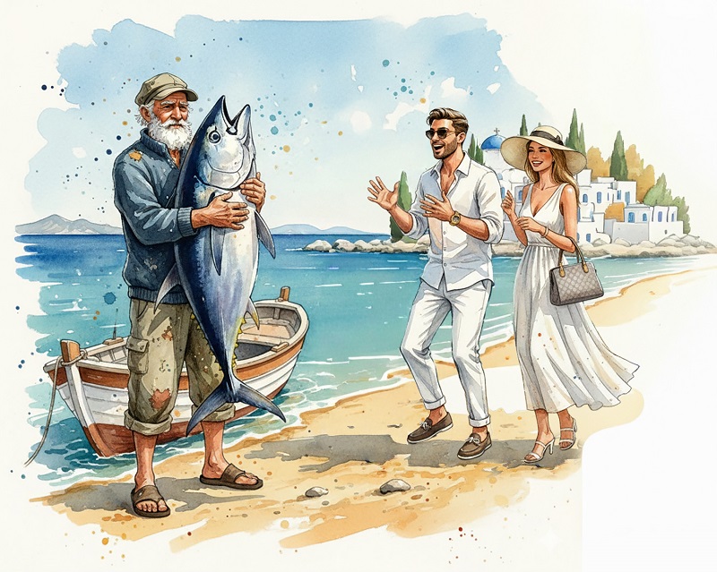Một nhóm khách du lịch tới một ngôi làng nhỏ ven biển Hy Lạp. Họ thấy một người đánh cá vừa kéo lên một con cá ngừ to, tươi rói.