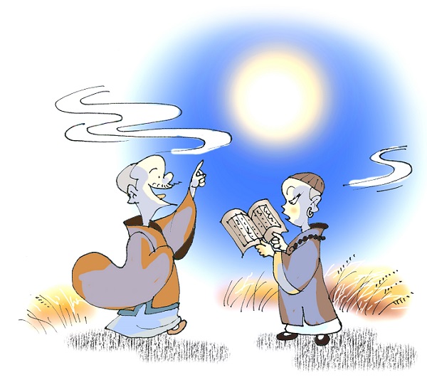 Lục Tổ Huệ Năng cầm quyển kinh đưa cho ni sư, nói: Ta không biết chữ, con hãy đọc. Ta sẽ giúp con hiểu.