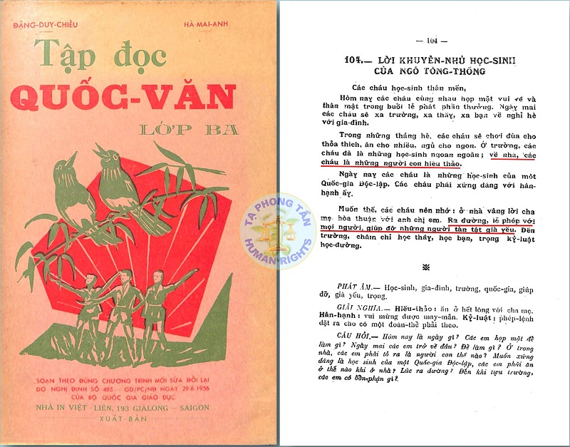 Hôm nay các cháu cùng nhau họp mặt vui vẻ và thân mật trong buổi lễ phát phần thưởng. Ngày mai các cháu sẽ xa trường, xa thầy, xa bạn về nghỉ hè với gia đình. Trong những tháng hè các cháu sẽ chơi đùa cho thoả thích, ăn cho nhiều, ngủ cho ngon. Ở trường các cháu đã là những học sinh ngoan ngoãn; về nhà, các cháu là những người con hiếu thảo. Ngày nay các cháu là những học sinh của một Quốc Gia Độc Lập. Các cháu phải xứng đáng với hân hạnh ấy. Muốn thế các cháu nên nhớ: Ở nhà vâng lời cha mẹ, hòa thuận với anh chị em. Ra đường, lễ phép với mọi người, giúp đỡ những người tàn tật, già yếu. Đến trường, chăm chỉ học thầy, học bạn, trọng kỷ luật học đường.” (Quốc Văn lớp Ba, xuất bản năm 1956.)